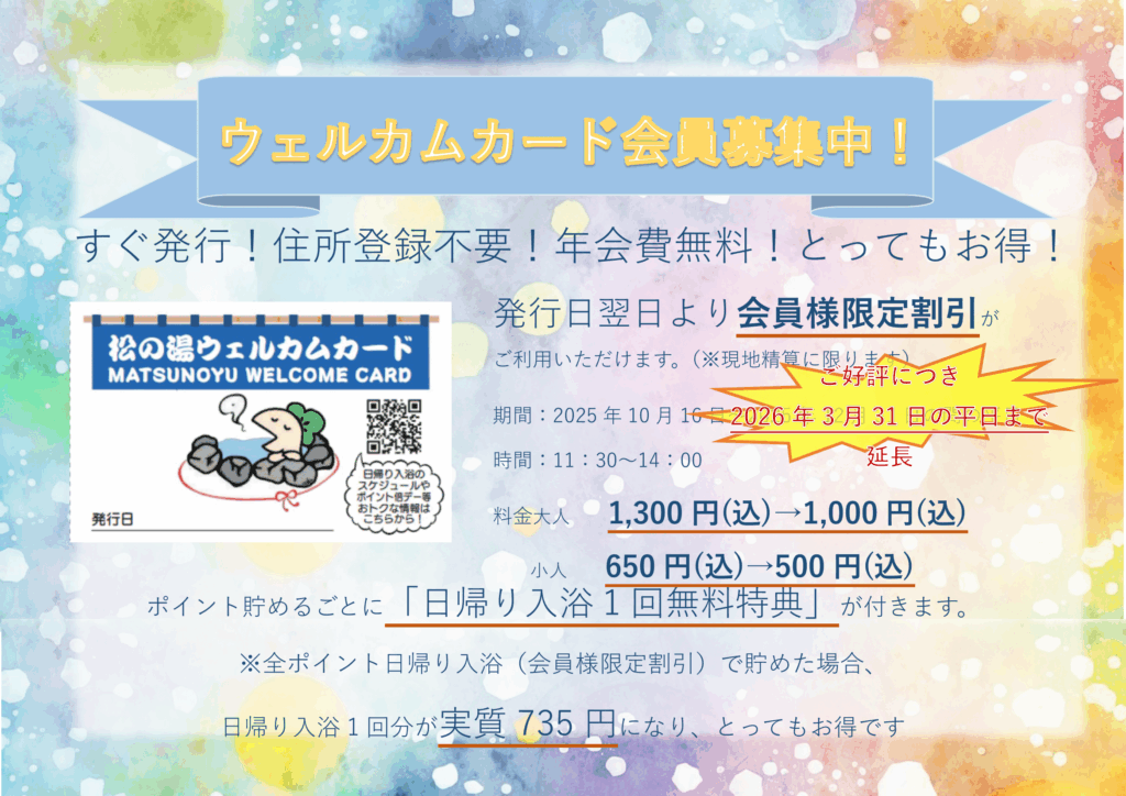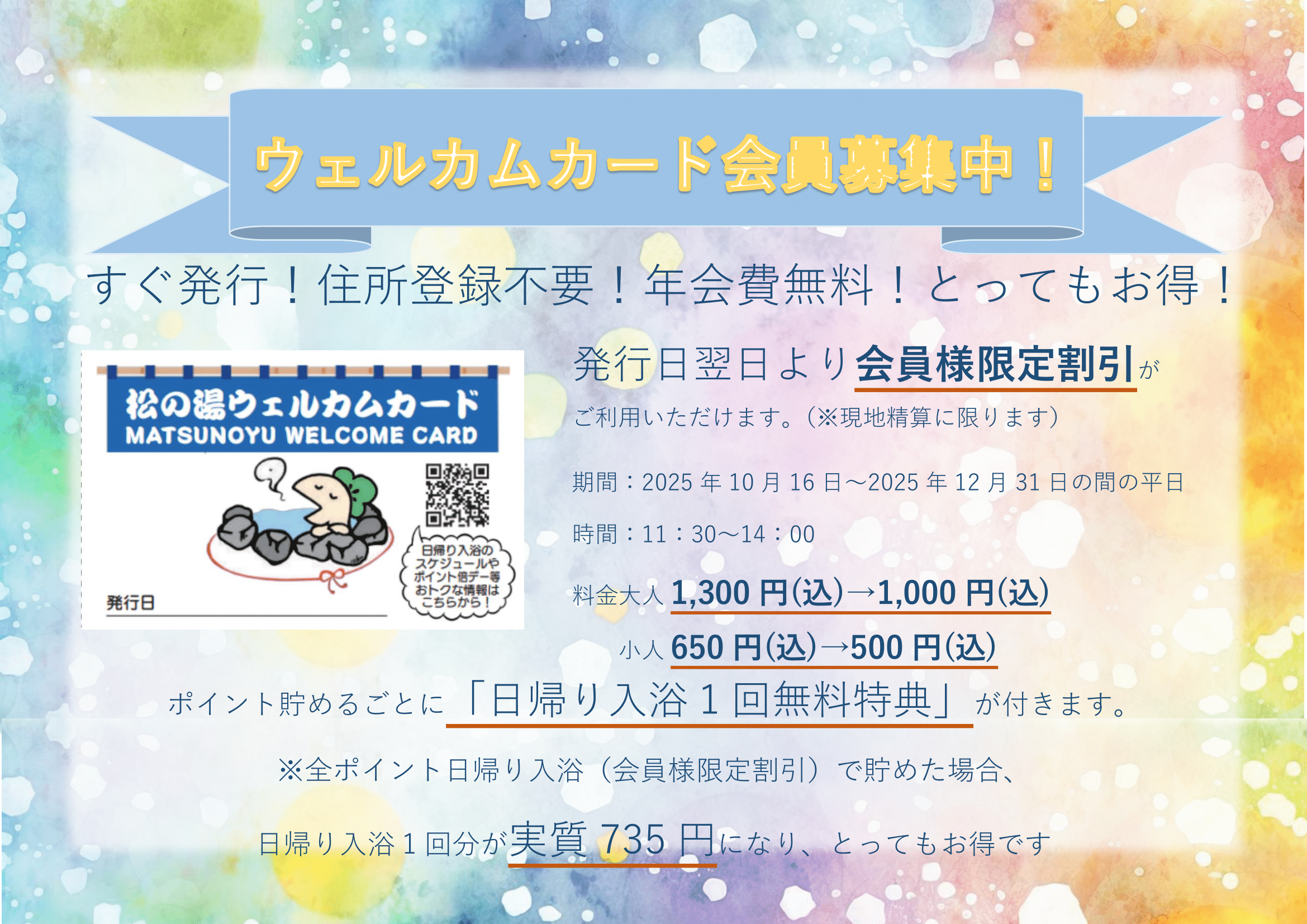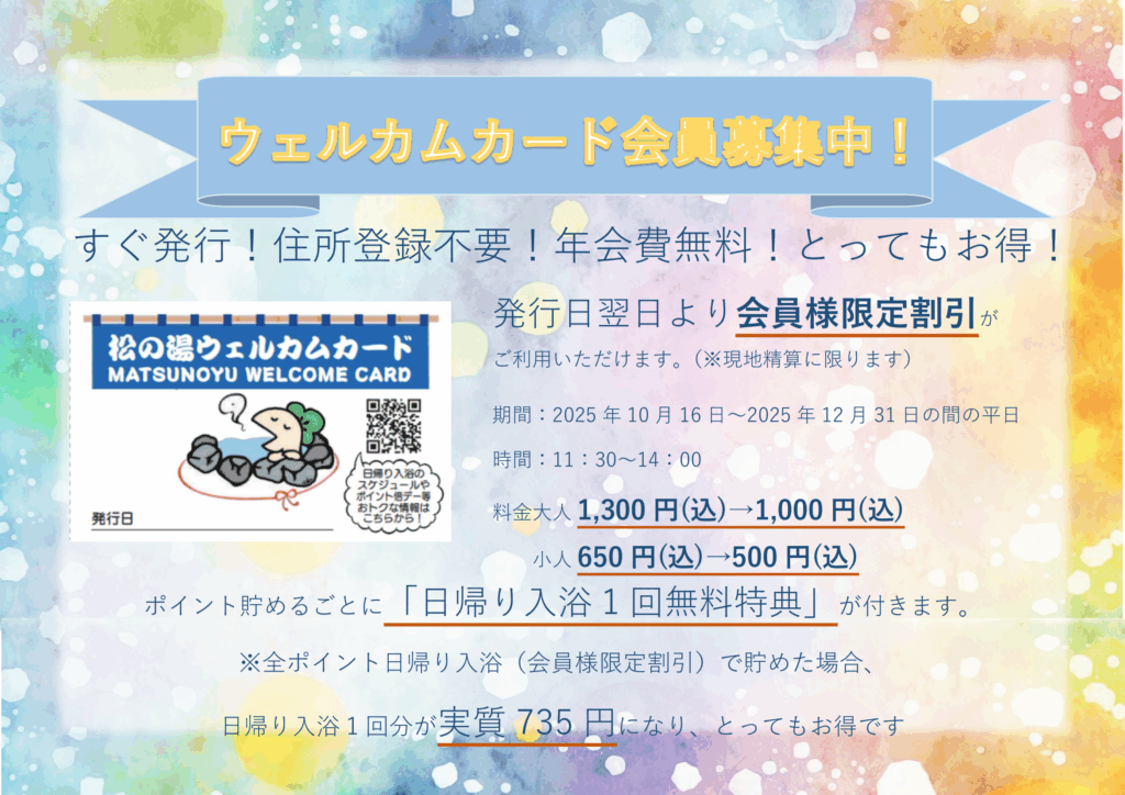 - ウェルカムカード発行翌日より、日帰り入浴が会員様限定割引でご利用いただけます。